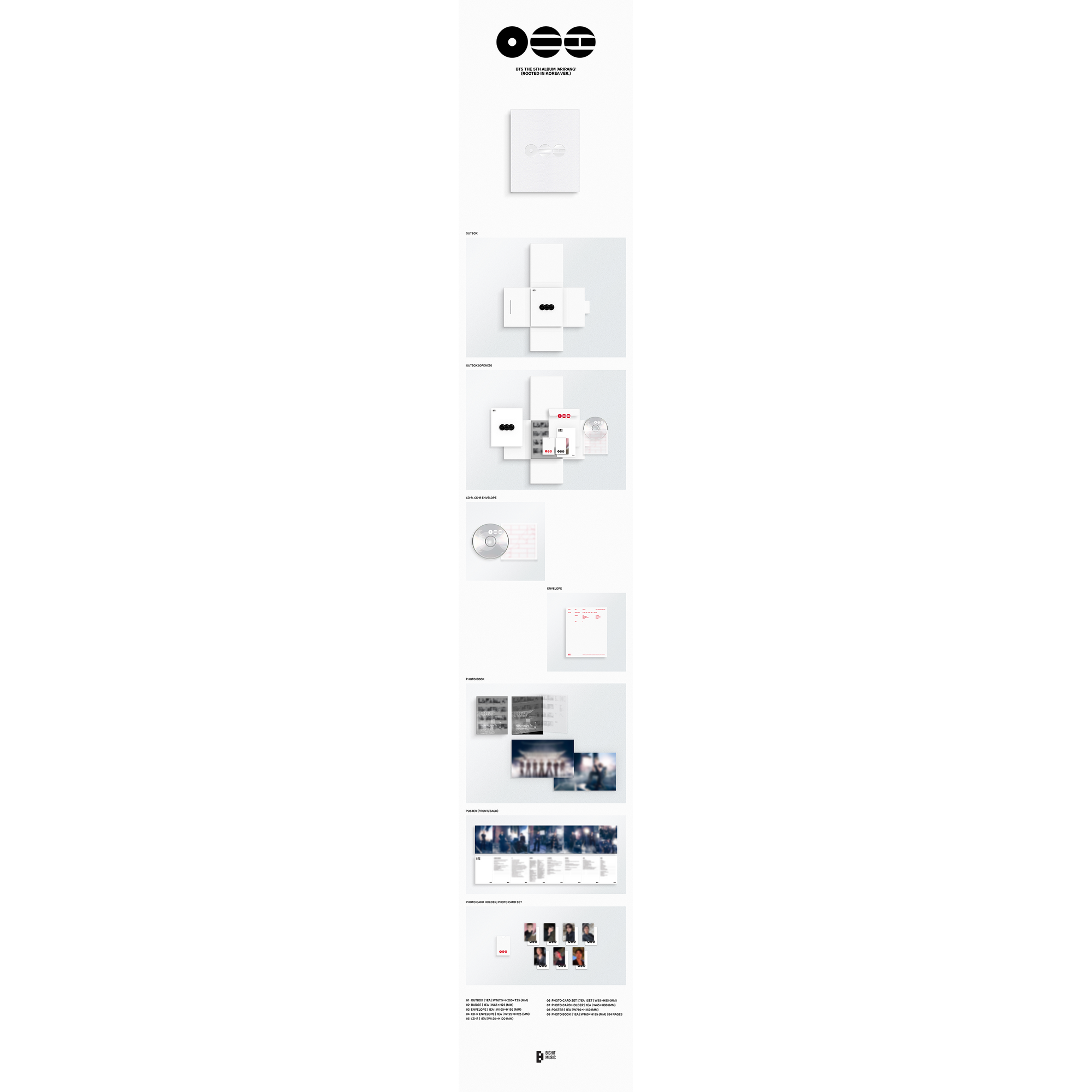 ARIRANG es el 5º álbum de estudio de BTS y su primer lanzamiento grupal en tres años y nueve meses. Estas dos versiones comparten el mismo álbum (mismo tracklist) y están pensadas para colección, pero cambian el enfoque del contenido físico: Rooted in Korea prioriza photobook + póster y elementos tipo badge/envelope, mientras Rooted in Music se centra en material de letras y set de film photos. En ambas variantes, la edición BTS Store Exclusive incluye 1 photocard adicional.